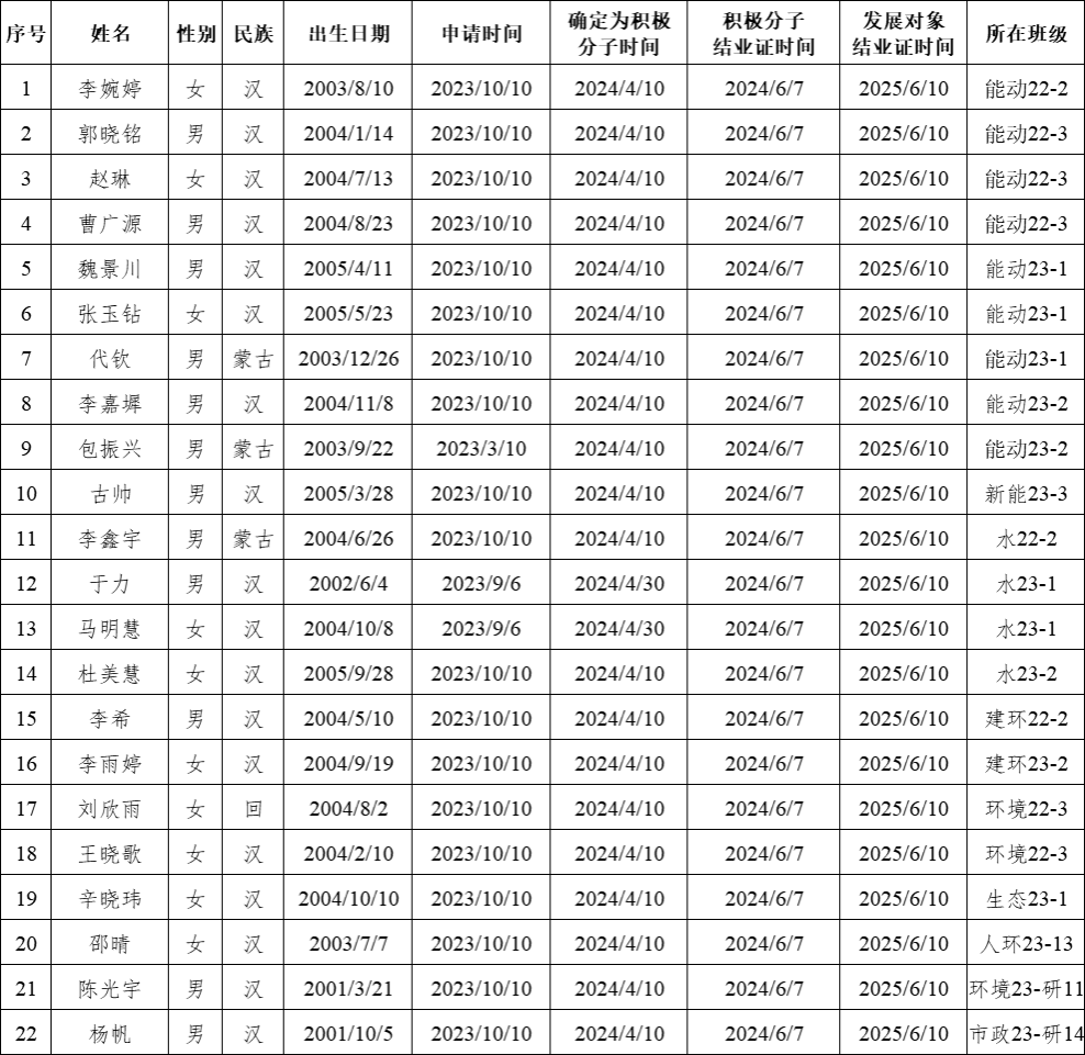 经过一年以上的培养教育和考察,李婉婷郭晓铭赵琳曹广源魏景川张玉钻代钦李嘉墀包振兴古帅、李鑫宇、于力、马明慧、杜美慧、李希、李雨婷、刘欣雨、王晓歌、辛晓玮、邵晴、陈光宇杨帆共二十二位同志拟接收为中共预备党员(见附表)。为进一步增强发展党员工作的透明度,确保发展新党员的质量,根据《中国共产党章程》和《中国共产党发展党员工作细则》,现将发展对象的基本情况予以公示。