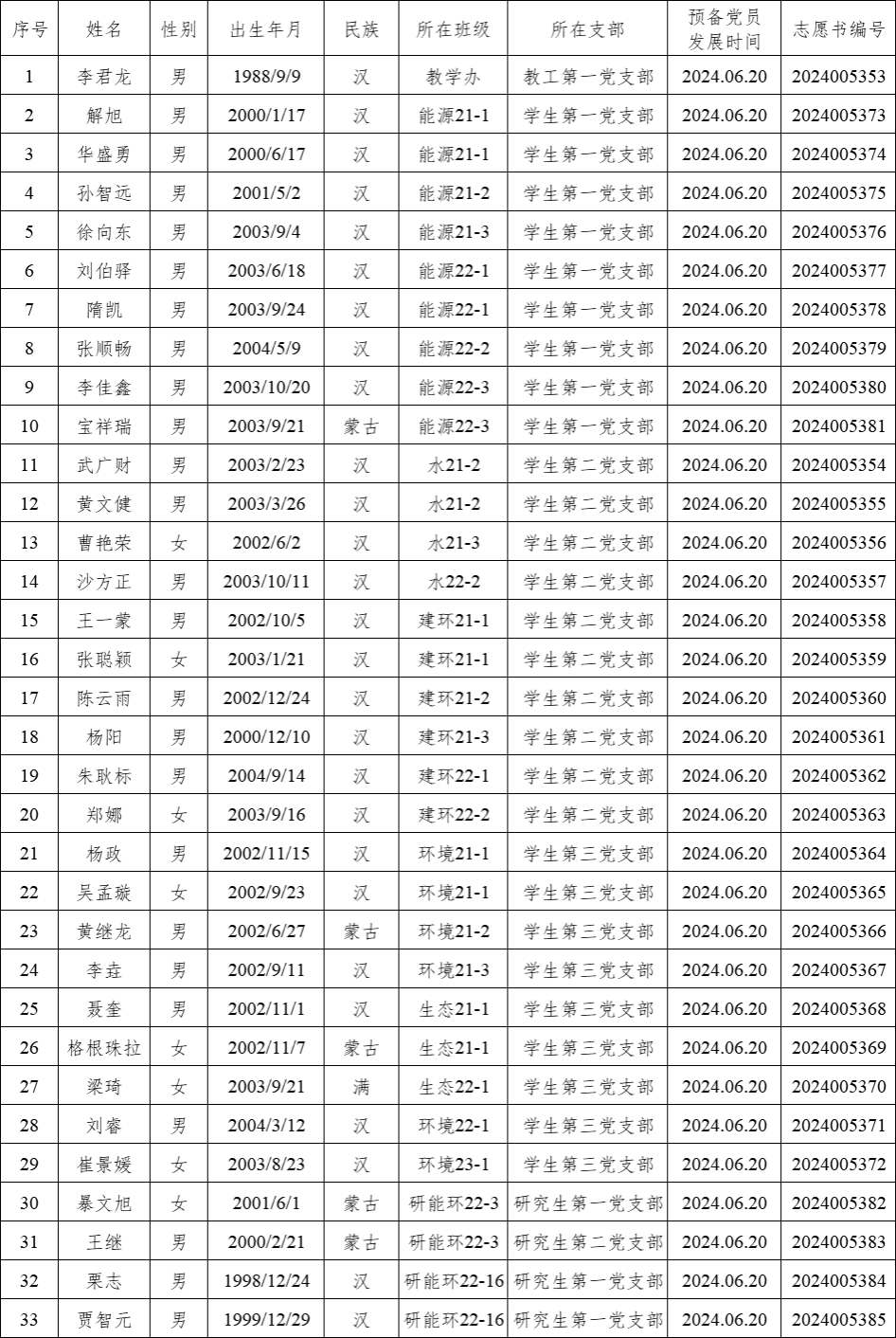 公示期从 2025 6 13 日至 2025 6 19 日止。在公示期内,任何单位和个人均可采用电话、信函或直接来访的形式,向太阳成tyc7111cc党委反映李君龙三十三位同志在政治立场、理想信念、思想品德、入党动机、工作表现、廉洁自律和遵纪守法等方面的情况,同时也可反映基层党组织在发展党员工作中坚持党员标准和发展党员工作程序等方面的情况。反映问题要求实事求是,客观公正。