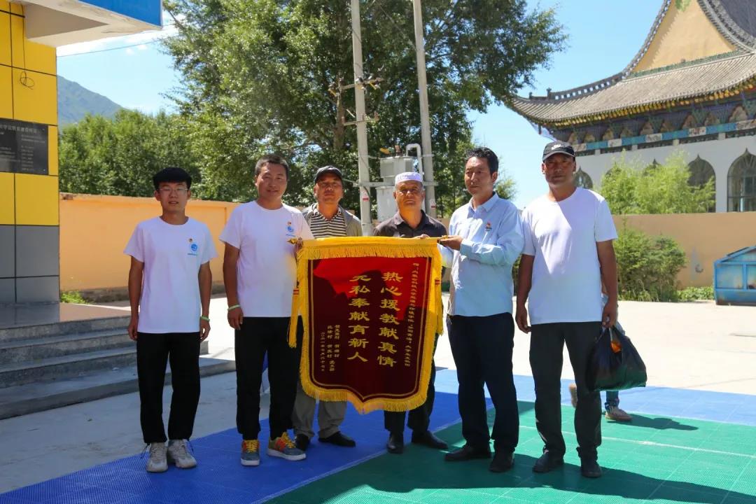 7月30日,道帷藏族乡四位村支书与部分党员代表,怀着对“梦圆青海”支教团的关怀,来到了道帷藏族乡贺塘小学慰问了支教团全体成员,实地察看了支教队员们的工作、学习、生活环境,详细了解他们支教的情况,并为全体支教团成员送去了“热心援教献真情·无私奉献育新人”的主题锦旗,表达了对支教团关心与感谢。四位村支书记与全体支教团成员进行了亲切的交谈,对支教团成员的工作生活情况进行了询问。他们表示,老员工支教是对国家教育事业做出自己的贡献,实现自身价值的良好途径。他们的声声关切如一股清泉,淌入每一位支教队员的心里。