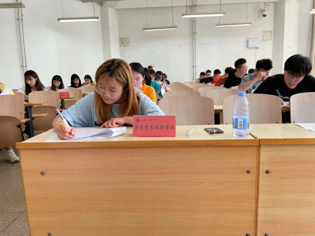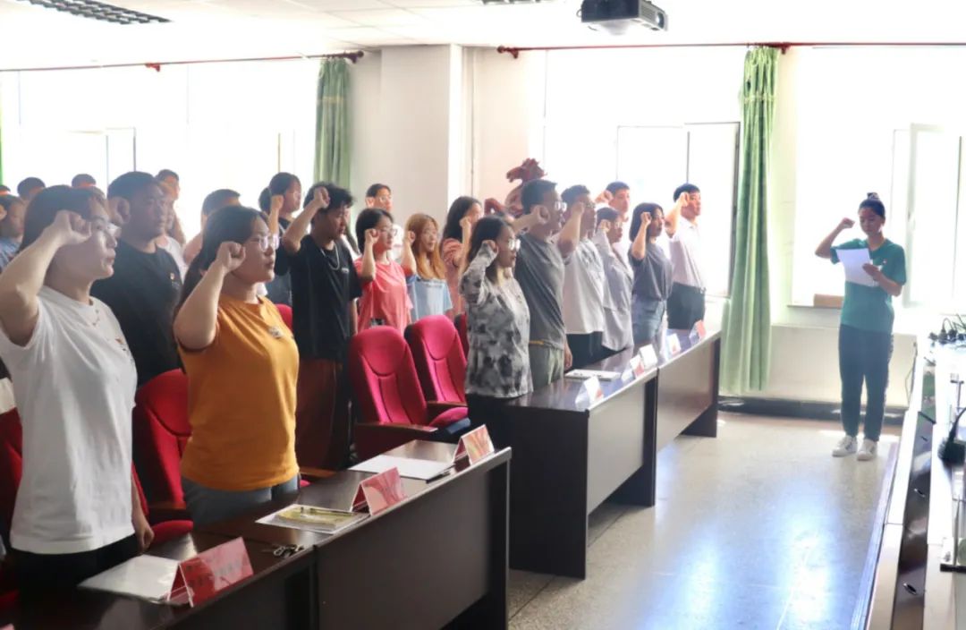 预备党员刘灿带领全体同学庄严宣誓,严肃考风考纪,坚决抵制考试舞弊行为。