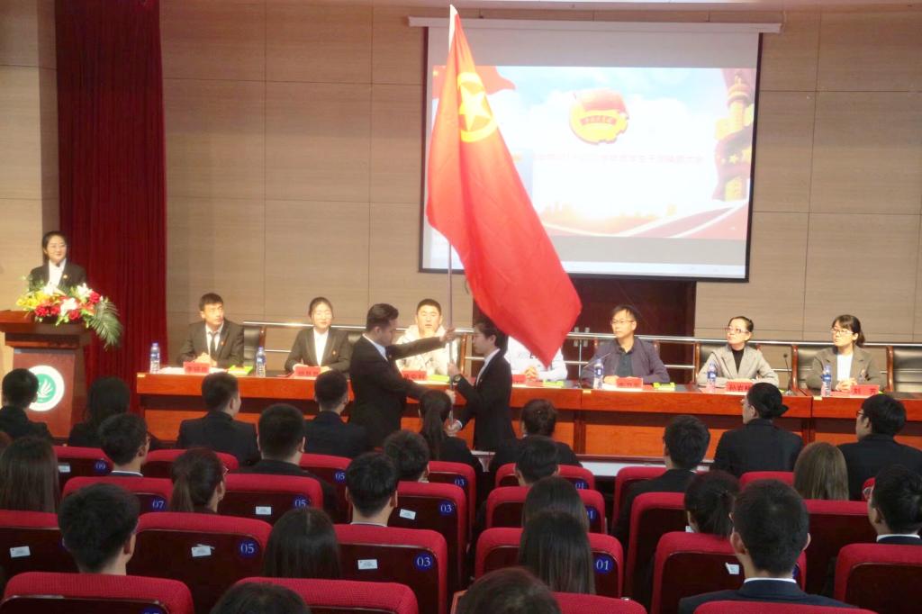 全体2018届员工干部代表为2019届员工干部代表授团旗、戴团徽,诠释了公司员工组织薪火相传、接力梦想的信念和决心。
