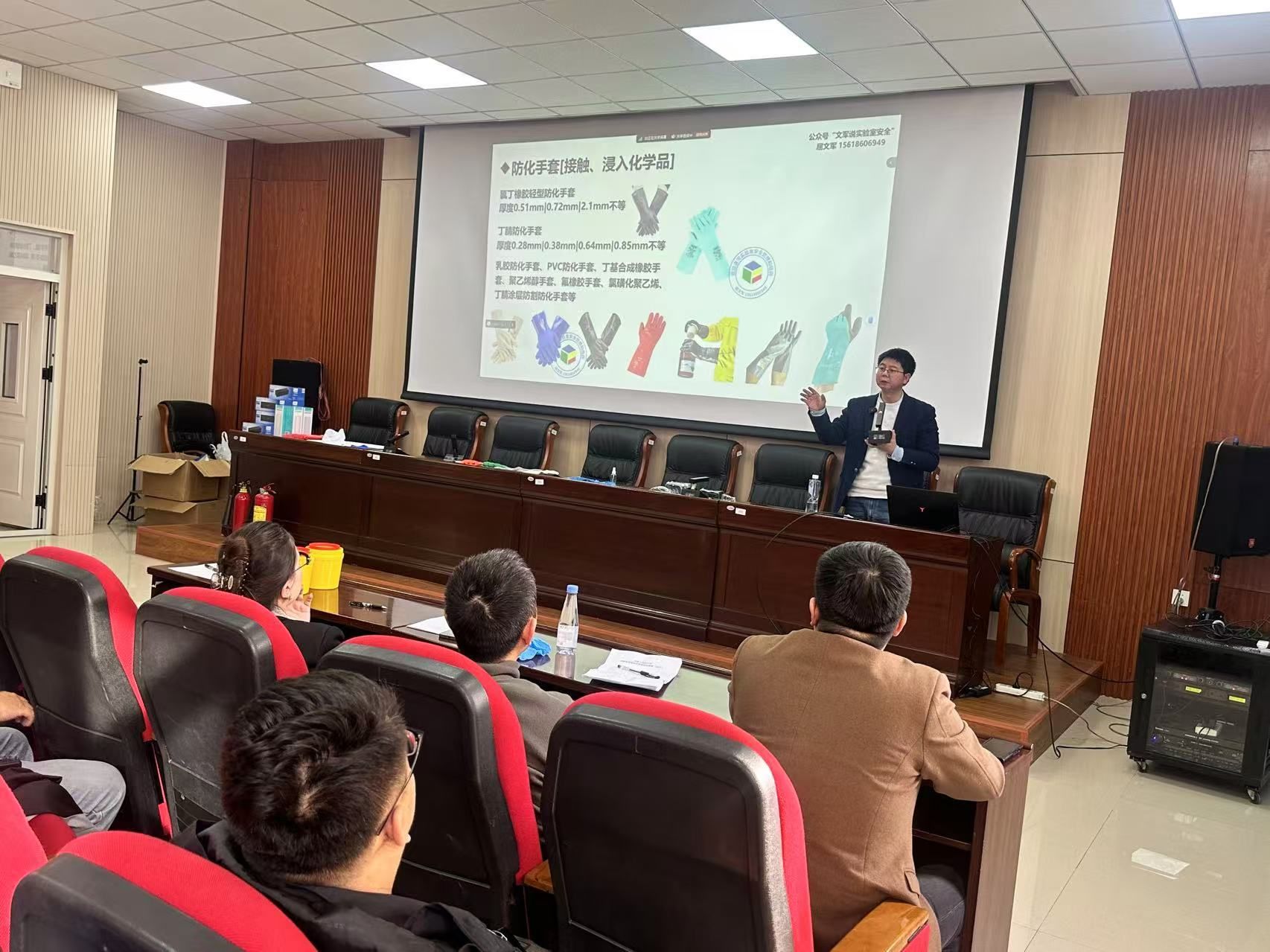 培训讲座上,屈文军老师向员工们介绍了实验室安全管理及检查的要求,介绍了实验室气瓶、危化品、仪器和水电等方面的安全知识,分享了关于实验室安全隐患及应急处理流程,现场演示了安全防护用品的使用方法。通过讲解,师生们对危化品管理的科学方法和有效防护手段有了更为全面的了解。