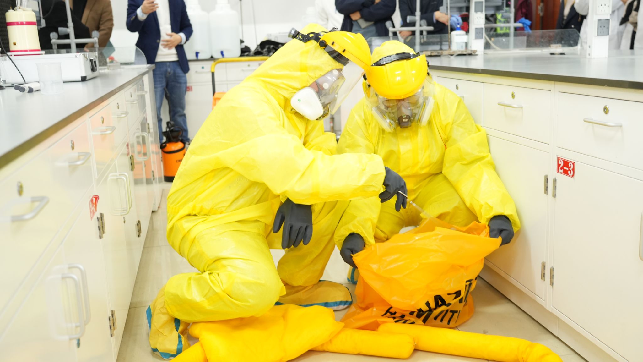 随后,在逸夫楼E区一楼化学与化工公司实验室进行了现场应急演练。演练根据实验室化学品使用情况及实验室真实环境,模拟了突发实验室安全事件。演练按照现场伤情处置、受伤人员互救、人员疏散、现场警戒封锁、逐级事故上报、应急救援人员个人防护穿戴、排查消除危险源、洗消除污、现场恢复等应急处置流程开展。各环节安排紧凑,员工积极参与,有序进行。配合专家实时解说,让师生通过现场沉浸式的观摩体验,真切感受到演练对于现场正确处置的重要性,有效提升了师生的实验室安全意识。
