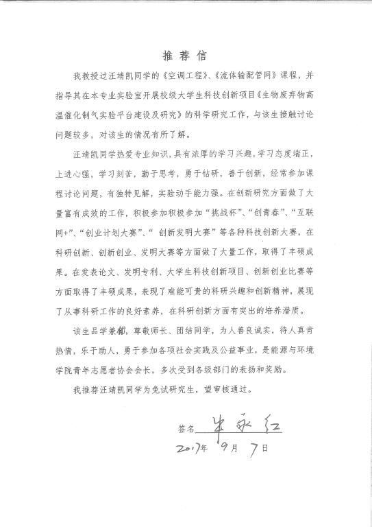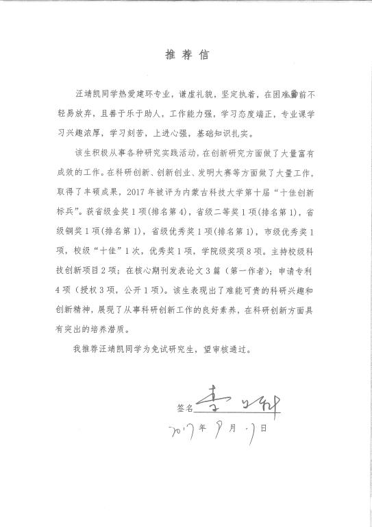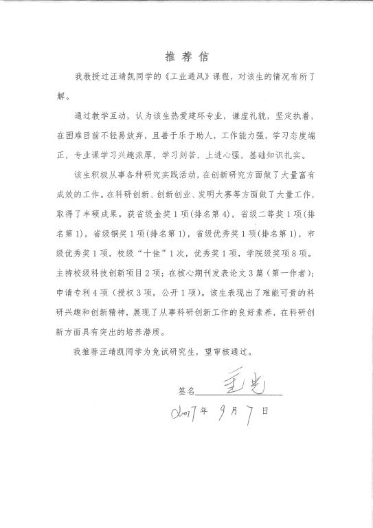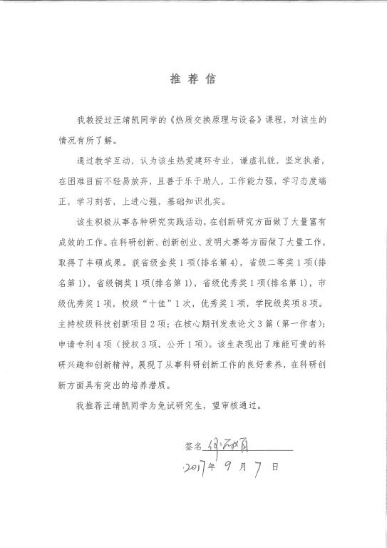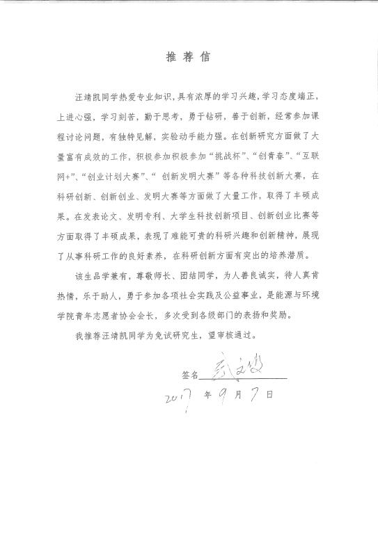关于汪靖凯同学硕士研究生推免教授推荐信及相关材料的公示