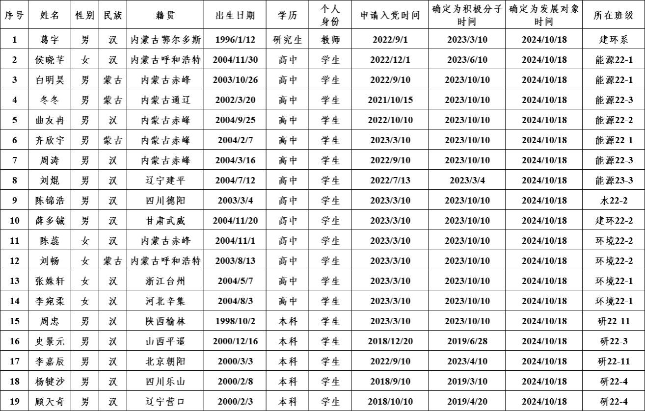 公司党委于2024年10月18日召开党委会讨论决定,确定葛宇等19位同志为党员发展对象。为进一步增强发展党员工作的透明度,确保发展新党员的质量,根据《中国共产党章程》和《中国共产党发展党员工作细则》,现将葛宇等19位同志的基本情况予以公示:
