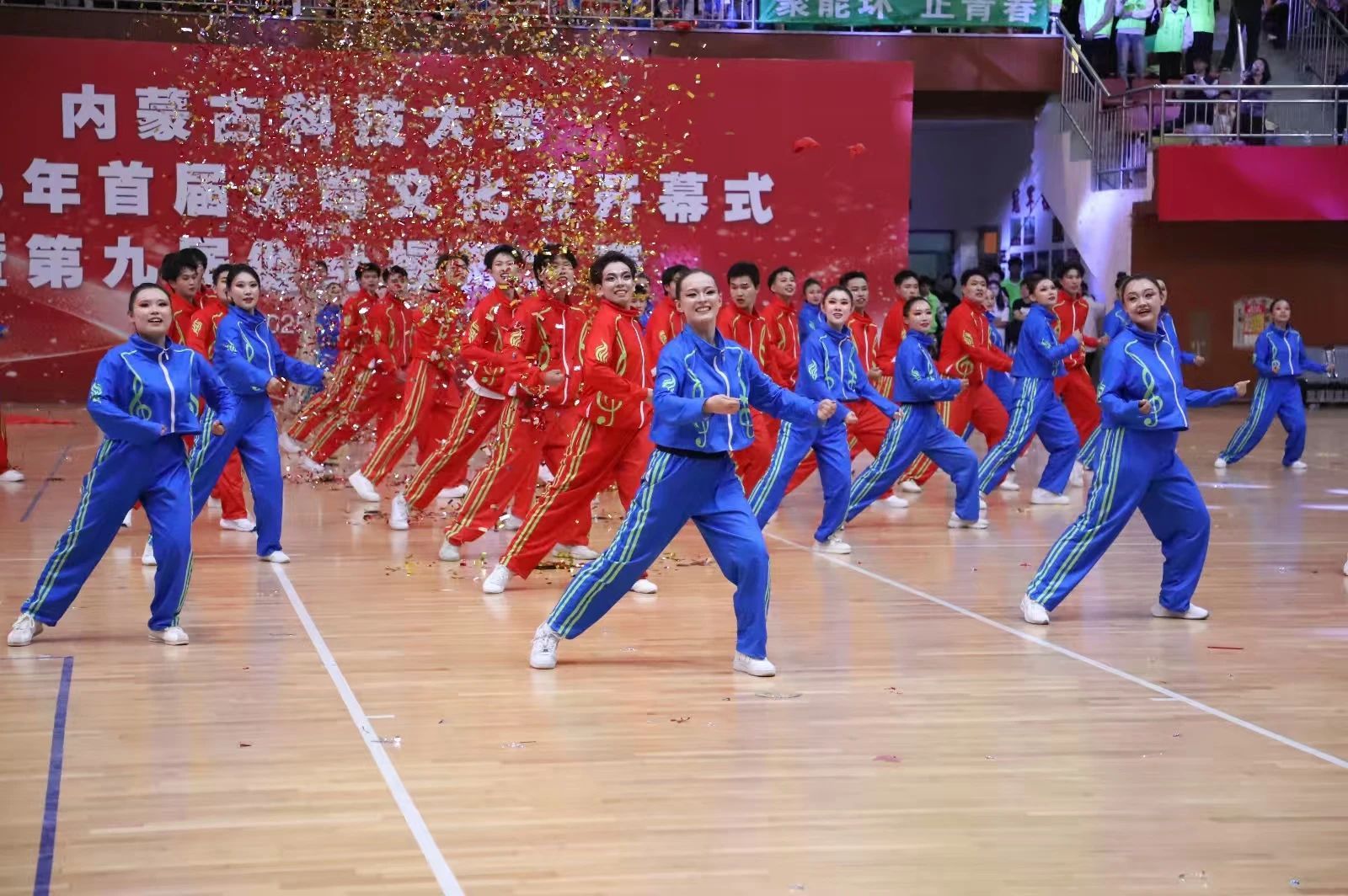 一支身着红蓝两色亮眼队服的队伍