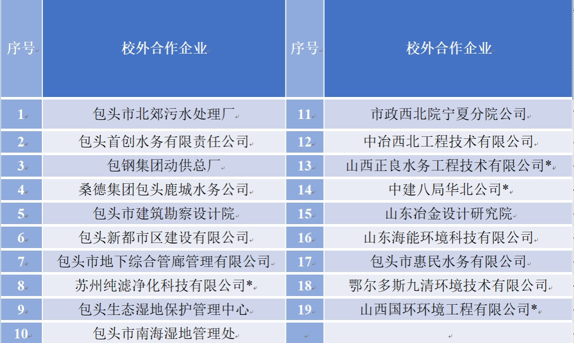 先后与山东冶金设计研究院、山东海能环境科技有限公司、鄂尔多斯九清环境技术有限公司、包头市惠民水务有限公司签订战略合作协议,目前已有产学研合作基地19家。