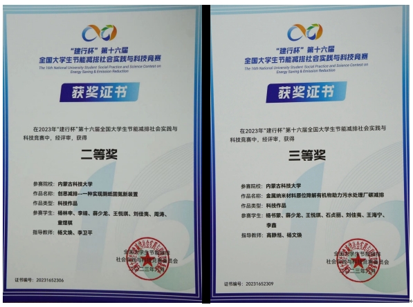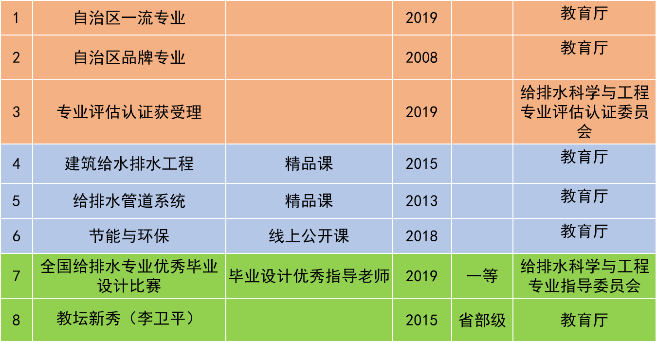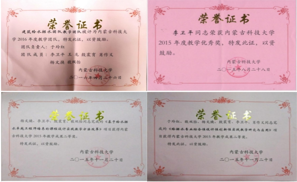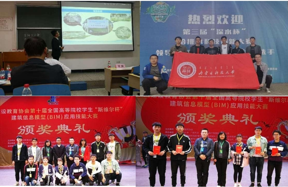 专业现有内蒙古自治区精品课2门,校级教学团队1个,校级精品课4门,校级重点课5门,获得校级教学成果奖多项,发表教改论文30余篇,出版教材10余部。近3年来获得优秀毕业设计国家级一等奖1项,自治区级教学改革项目4项;产教融合成效显著,员工参与各类科技创新竞赛获省部级以上奖30余项,授权专利15项;教师为企业培训技术人员200余人次,联合申请科研项目9项。本专业员工在省部级及以上各类重要学科竞赛中表现突出,在各类BIM竞赛、“深水杯”创新大赛、老员工挑战杯、全国给排水专业毕业设计大赛等科技竞赛和专业比赛中获得省部级以上奖励30余项。
